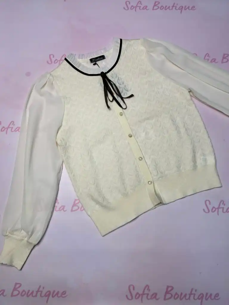 Блуза от фино плетиво в нежен бежов цвят и акцент шифонен ръкав, който придава елегантност и женственост на визията.