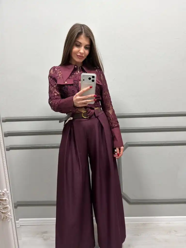 Елегантна дамска риза от едра дантела в наситен бордо цвят, която съчетава женственост и изтънчен стил. Моделът се отличава с деликатна флорална дантела, леко вталена кройка и изискан завършек, подчертаващ силуета.