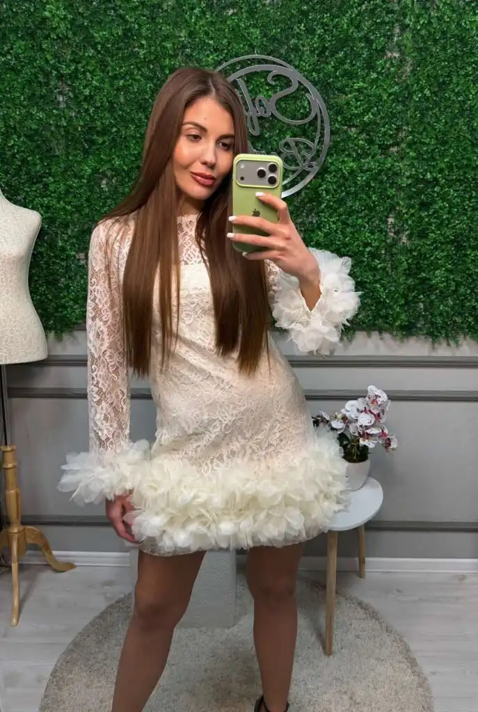 Къса дамска рокля от фина дантела в млечно-бял цвят. Моделът е с дълги ръкави, завършващи с богати маншети от мек тюл. Долната част на роклята е подчертана с обемна тюлена волана, която придава ефирност и романтично излъчване. Силуетът е женствен и елегантен, съчетаващ класическа дантела с модерни акценти.