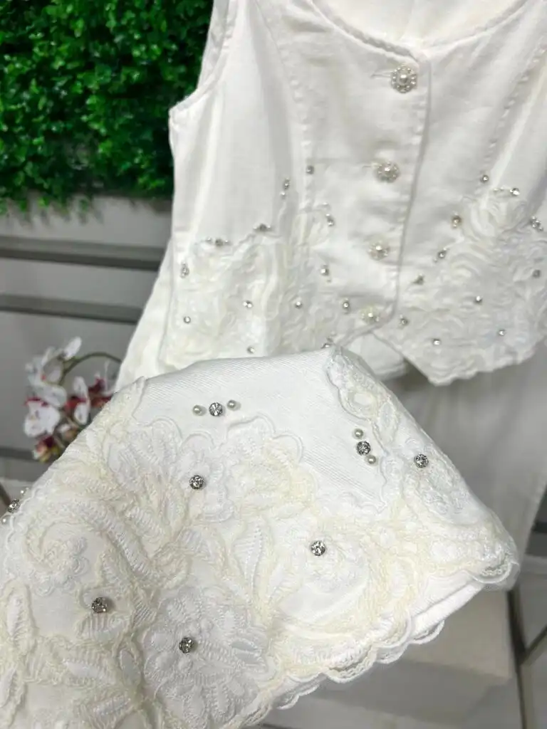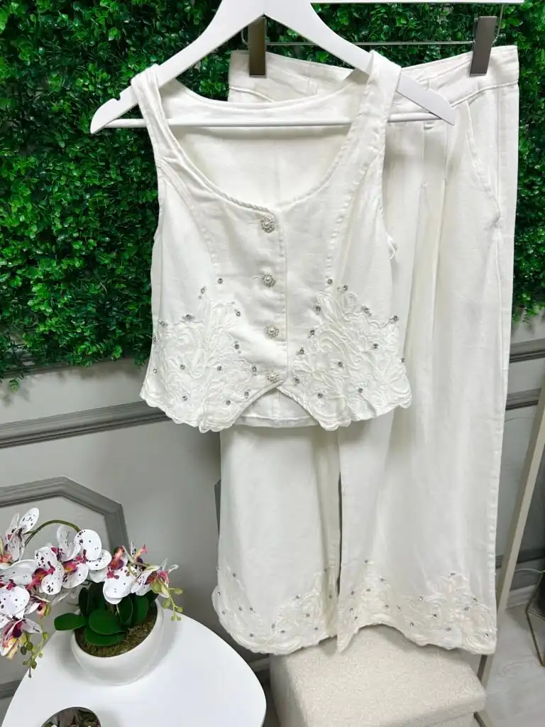 Бял дънков комплект от елек и широк панталон с фина флорална бродерия. Елегантен дизайн, лека материя и изчистена линия – перфектен избор за стилни летни поводи и специални моменти. Размери С, М, Л