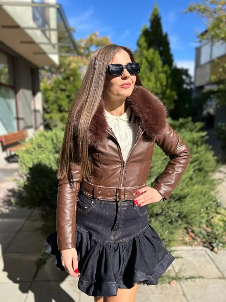 Стилно късо кафяво кожено яке с мека и топла подплата, което осигурява комфорт и защита от студа. Перфектно за ежедневни градски визии или за по-елегантни комбинации. Якето има класическа кройка с цип и леко прилепнала линия, подчертаваща силуета.