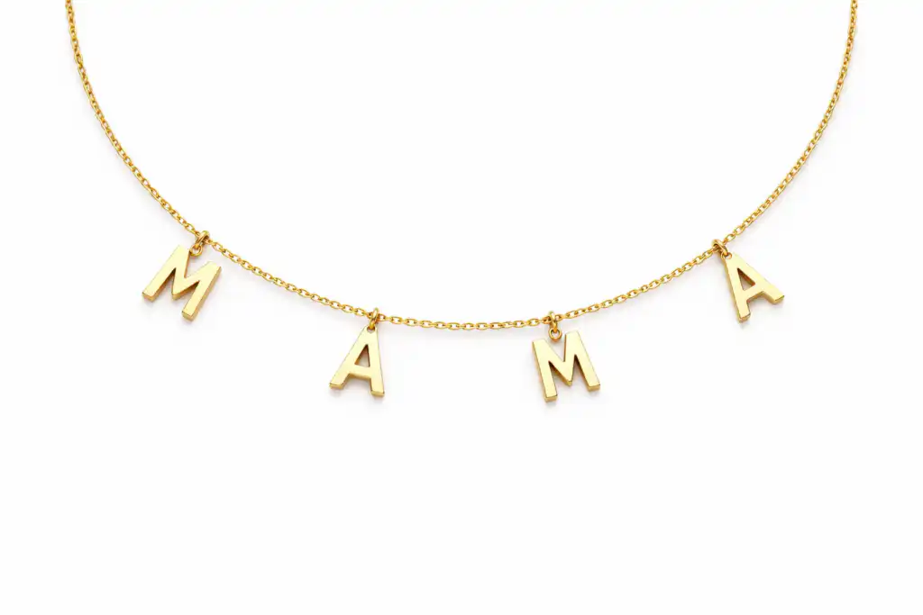 Нежно персонализирано колие от неръждаема стомана с висящи букви, оформящи надпис MAMA, изработено в изчистен минималистичен стил. Фината верижка и полираният златист завършек придават деликатна елегантност, а буквите създават емоционален и стилен акцент. Подходящо е както за ежедневно носене, така и като специален подарък с лично значение.