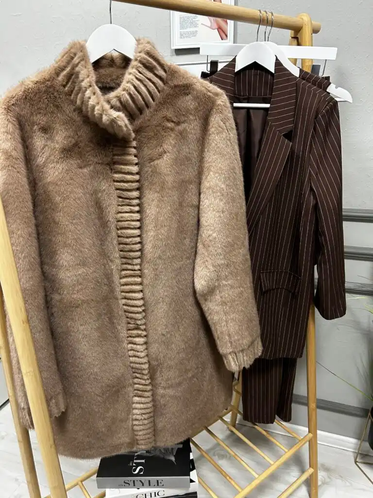 Палто от висококачествен еко косъм, има връзки от вътрешната страна на талията за регулиране.