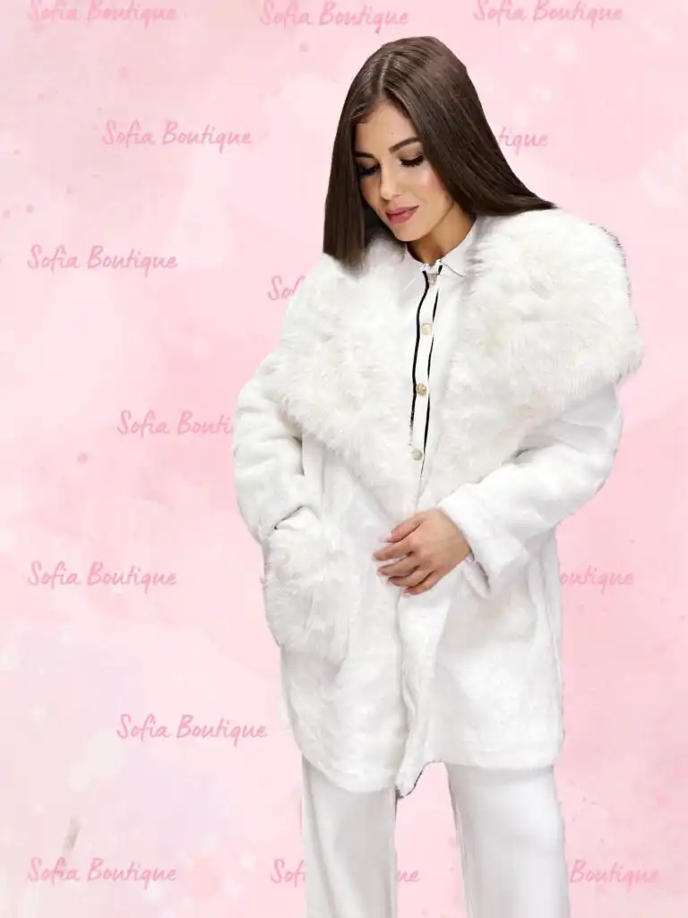 Луксозно бяло палто с изключително пухкава текстура, което излъчва елегантност и нежност. Акцентът е върху обемната, мека яка, придаваща кралско излъчване и допълнителна топлина. Джобовете са богато обкантени с пух, което добавя разкошен завършек.