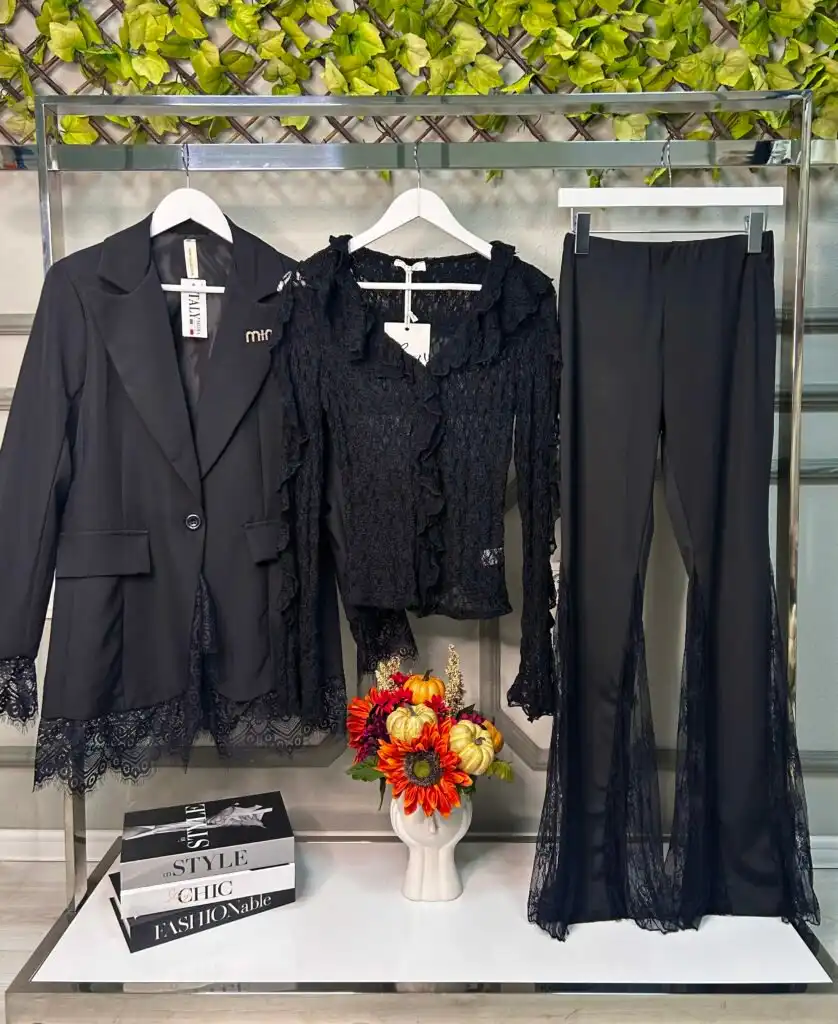 Елегантен дамски панталон, изработен от фина материя с деликатни дантелени акценти по крачолите.
