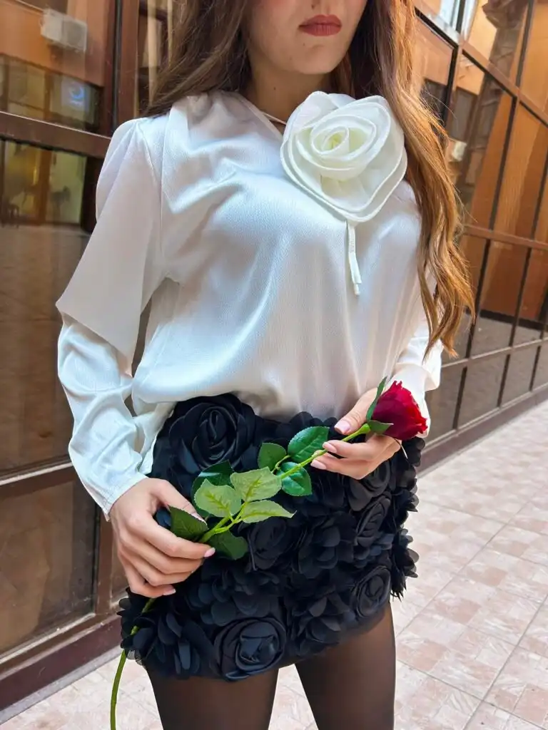 Къса пола в айвъри тон и черен цвят, богато декорирана с обемни 3D рози. Моделът впечатлява с релефна текстура и луксозно излъчване, което я превръща в истински акцент на визията. Полата подчертава талията и създава ефектна и женствена линия. Отзад е изчистена. Основата й е сатен.