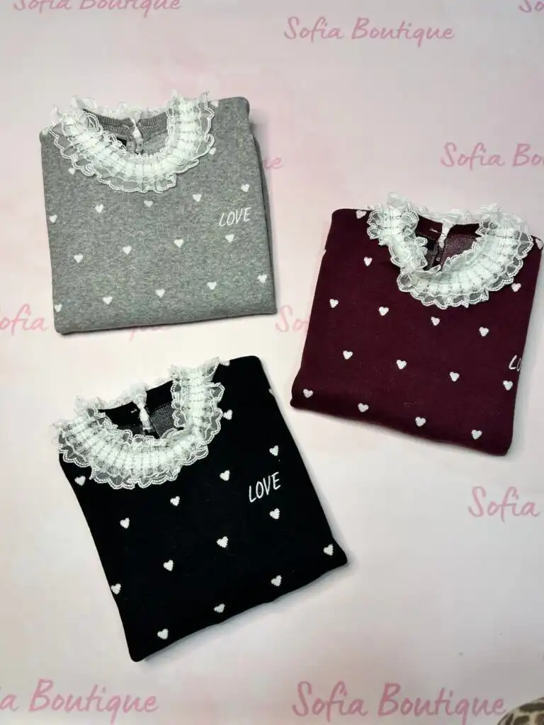 Страхотен пуловер с дантела и малки сърчица. Плетивото е изключително меко и еластично.