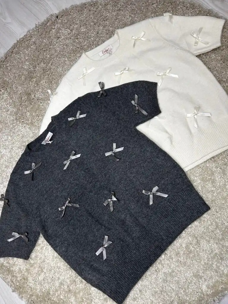 Елегантен пуловер с къс ръкав в сиво и бяло, декориран с множество нежни 3D панделки. Моделът съчетава стил и женственост, като придава изискан и модерен акцент на визията.