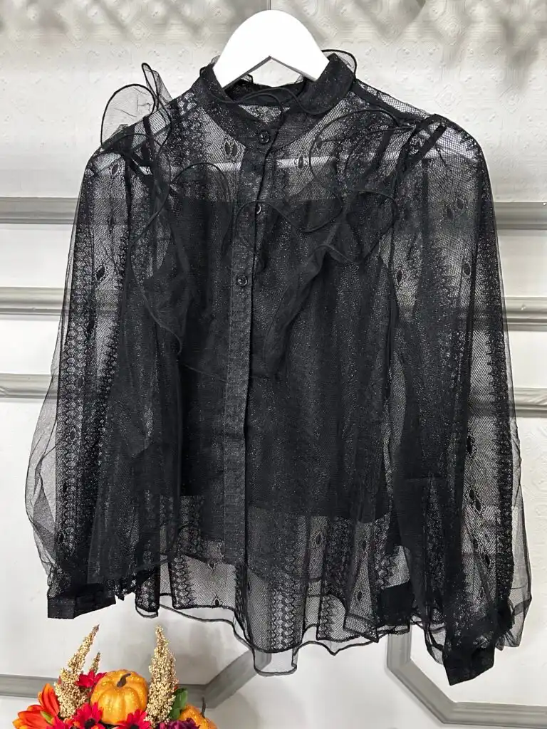 Ефирна черна риза от фин тюл с допълнителен мек топ отдолу. Моделът е допълнен с нежни волани, които придават романтичен и изискан силует. Подходяща както за вечерни поводи, така и за стилно ежедневие.