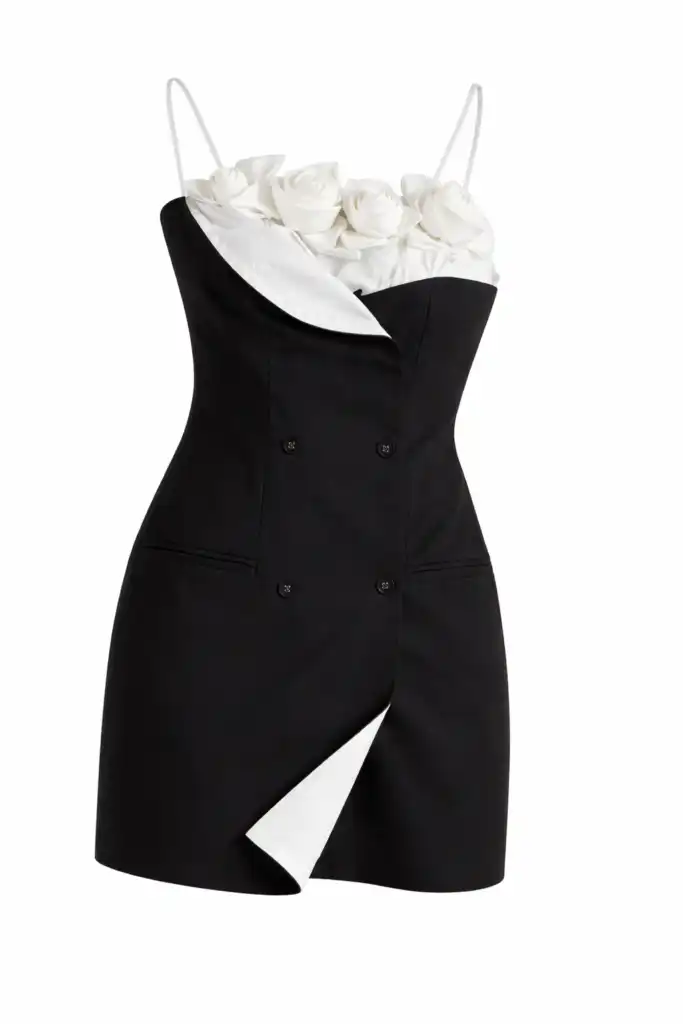 Луксозен модел с изразен дизайнерски характер, съчетаващ вталена линия, артистични флорални акценти и елегантен силует. Обемните рози в горната част придават изисканост и уникално присъствие, а роклята се предлага както в нежен светъл вариант, така и в елегантно черно — за впечатляваща визия при всеки специален повод.