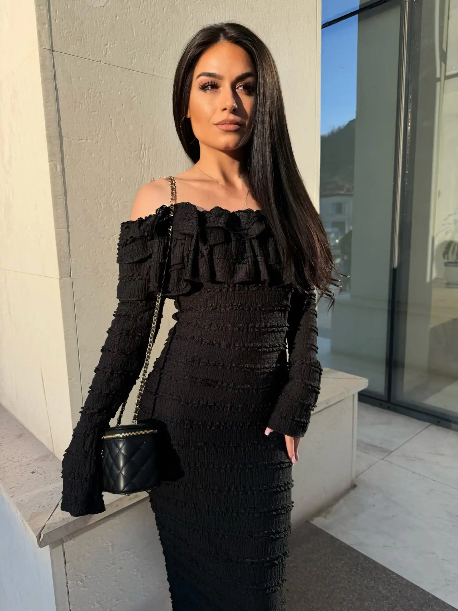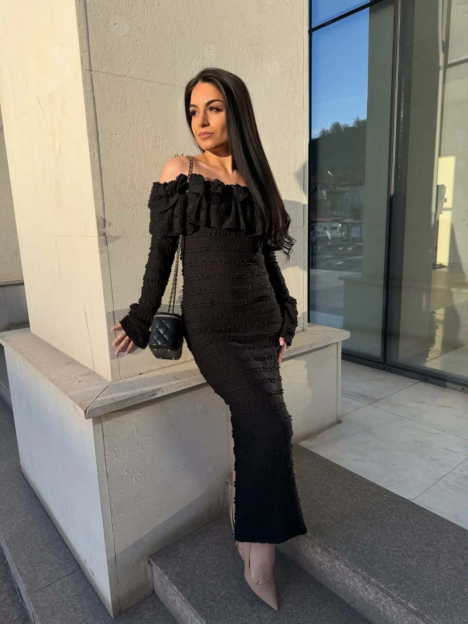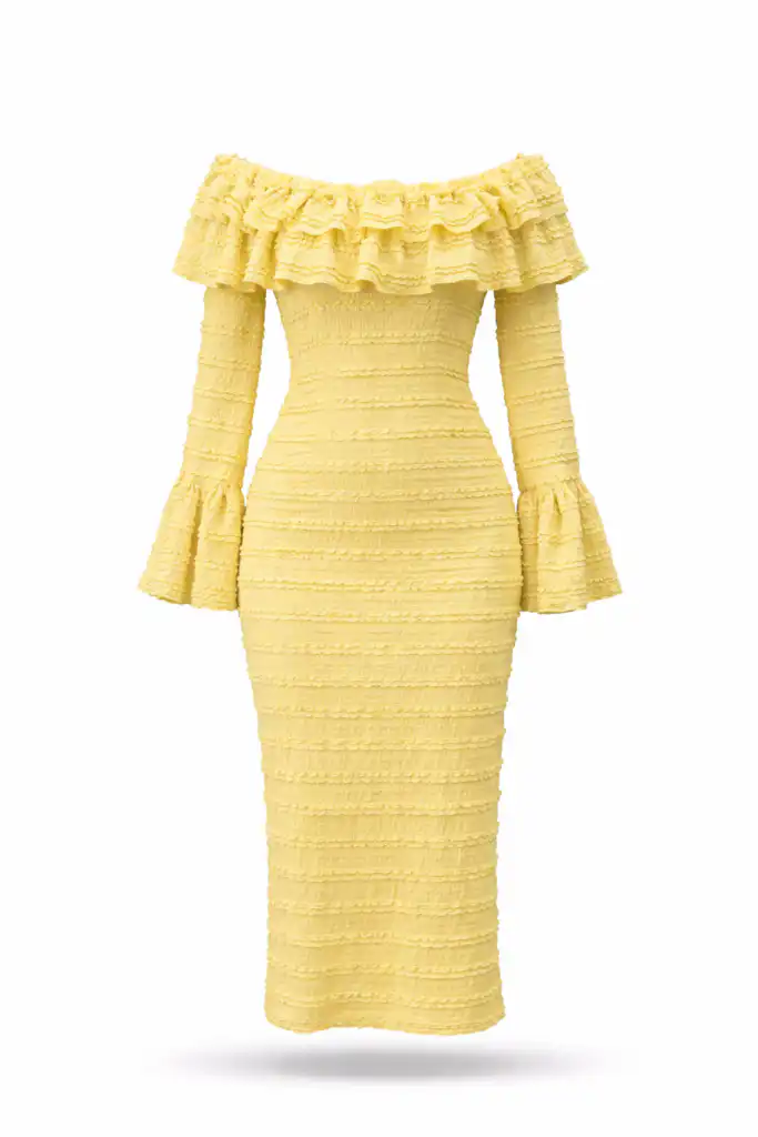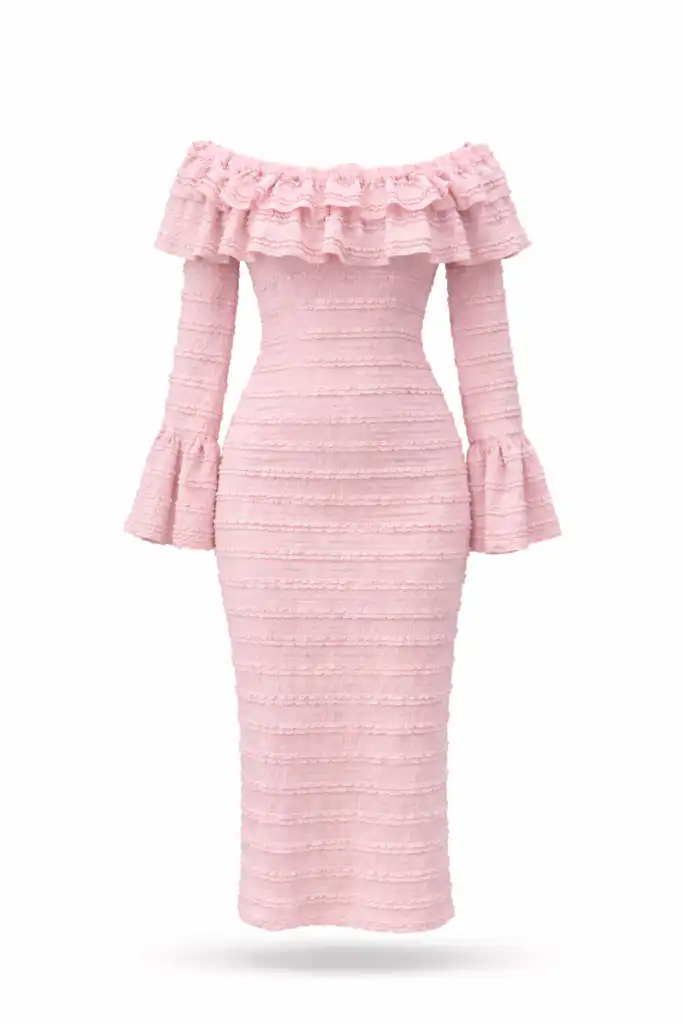 Моделът подчертава силуета благодарение на вталената кройка, а нежните релефни пластове придават стил и изисканост. Дългият ръкав и романтичното деколте тип „off-shoulder“ я правят перфектен избор както за специален повод, така и за вечерно излизане.