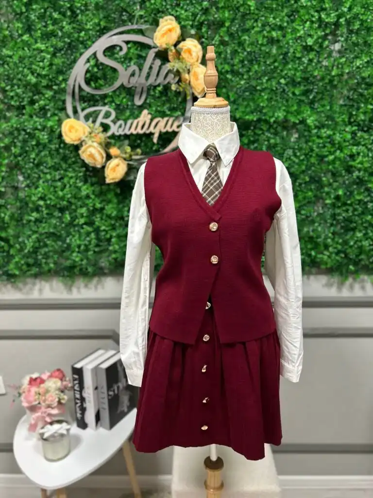 Елегантен плетен сет от елек и пола в наситен бордо нюанс, който излъчва женственост и стил. Елекът допълва силуета с изчистена линия, а полата подчертава фигурата с комфорт и мекота. Фината плетка осигурява приятно усещане и топлина