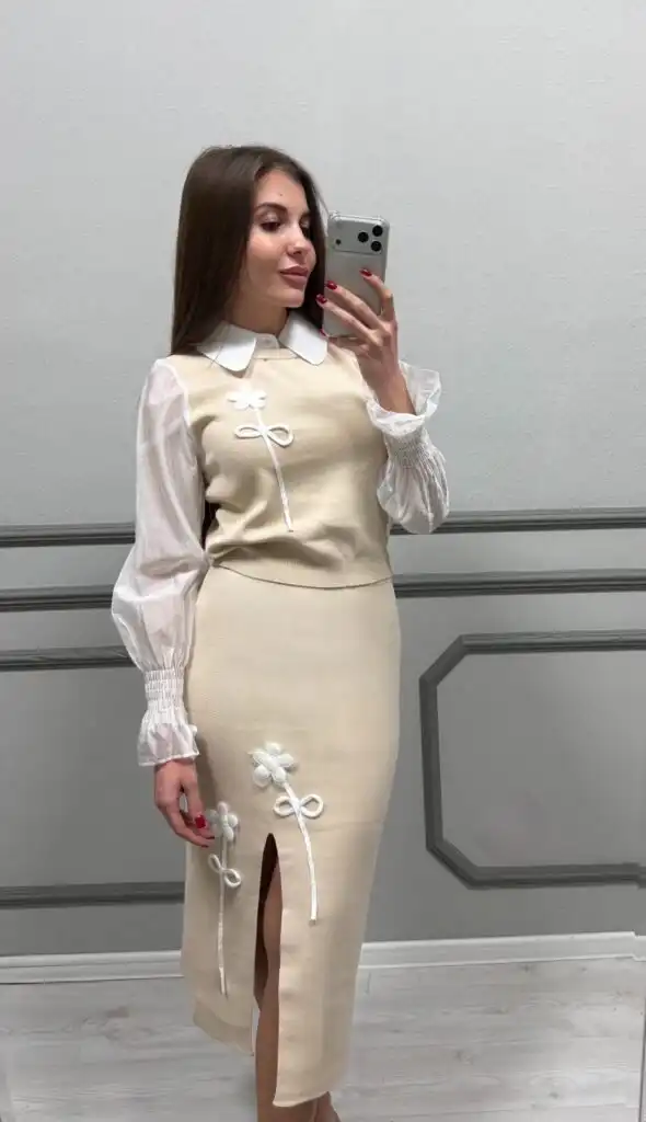 Елегантен дамски сет в нежен бежов нюанс, съчетаващ класика и модерна женственост. Комплектът включва пуловер с пришити яка и ръкави на риза и прилепнала миди пола с деликатна цепка, украсени с ефектни флорални апликации и декоративни връзки. Идеален избор за стилни дневни визии, официални поводи или елегантни срещи, при които изтънченият вкус е на фокус.
