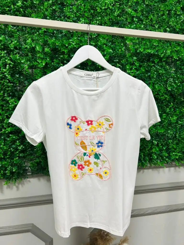 Тениска от памучна и еластична материя. Мечето е бродерия.