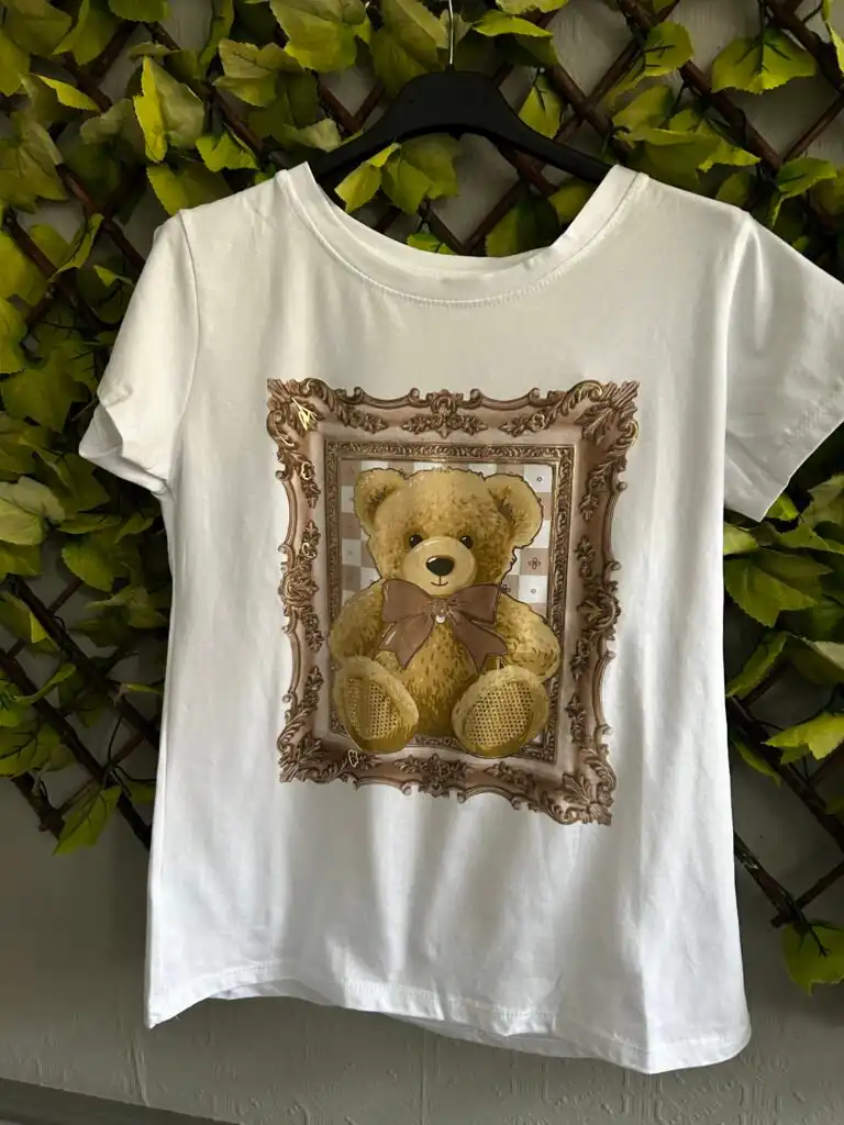 Памучна, еластична тениска с 3 различни щампи. Подходяща за гръдна обиколка до 100см.