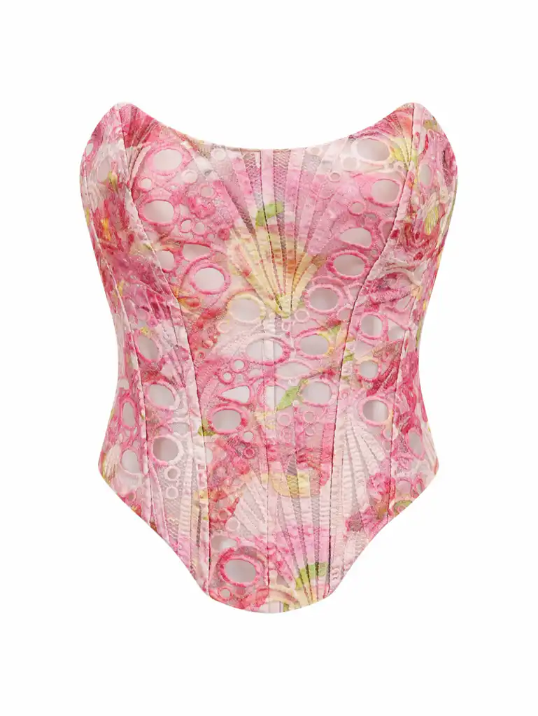 Елегантен корсет без презрамки с подчертана силуетна линия и твърда оформяща конструкция, регулираща се с връзки. Моделът е изработен в бяла основа с фин флорален десен и декоративна дантелена текстура.