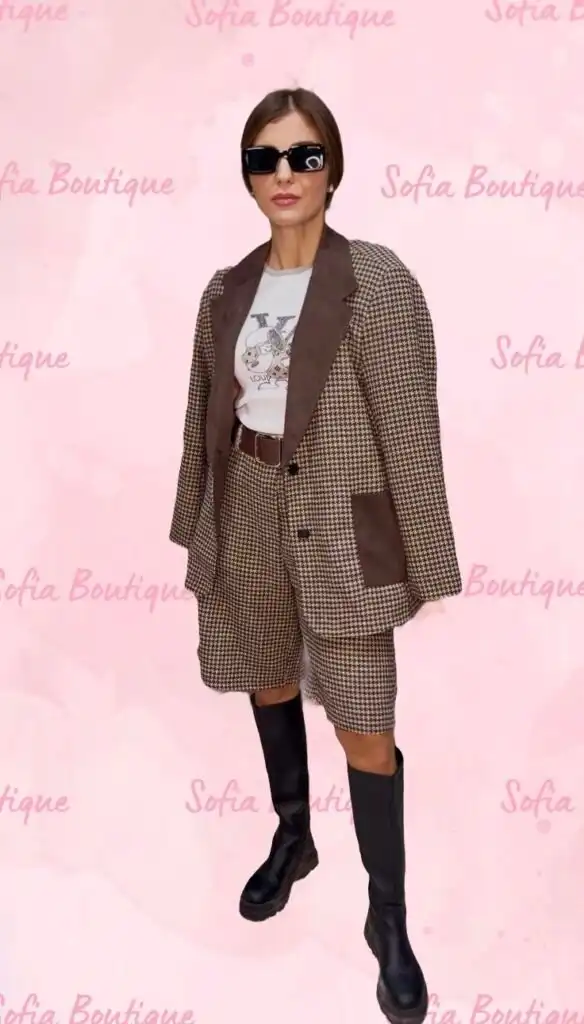 Елегантен сет от блейзър и панталони до коляното. Кафявото акцентира върху яката и джобовете.