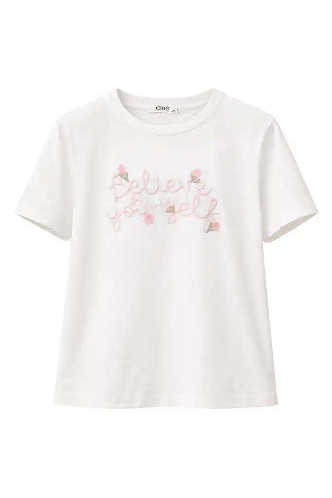 Бяла тениска с нежна 3D бродерия отпред и надпис “Believe yourself” в пастелно розово. Моделът е с удобна свободна кройка, изработен от мека и приятна материя, подходяща за ежедневни визии, комбинира се лесно с дънки, панталон или пола.